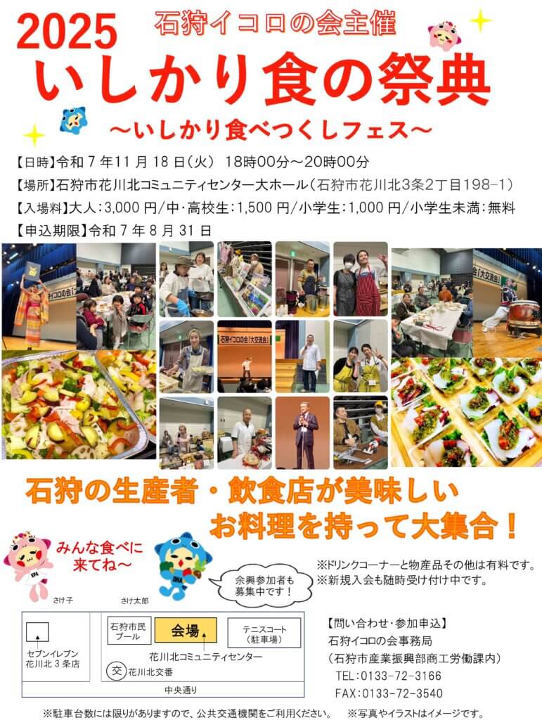 石狩イコロの会が主催する「大交流会」が、新たに「いしかり食の祭典」~いしかり食べつくしフェス2025として名を変えて開催されます。昨年から会場を石狩市北コミュニュティセンターへと移したことで、これまで会員限定で開催され来ましたが、一般市民をはじめた多くの人たちの参加が可能となり、食だけに拘らずに、美味しく楽しく楽しめる場として大盛況でした。昨年に引き続き、更なる拡大を模索することで、好評だった演芸やイベントPR及び告知コーナーをはじめ、今年は一般参者のステージ発表をも可能としています。趣味や特技、唄でも踊りでも語りでも、ぜーんぶ何でもありです。地産地消となる石狩市内の食材を中心に各銘店がこの日だけの特別メニューを味わえます。その品数の多さと旬な味わいに舌鼓、加えて飲んで食べて楽しんじゃう一夜限りのイベントです。また、石狩イコロの会は食品ロス「ゼロ」を推進しており、残った料理はお持ち帰りして頂ける嬉しい特典付です。もちろんお持ち帰り用の容器も準備しております。お値打ち間違いなし!
