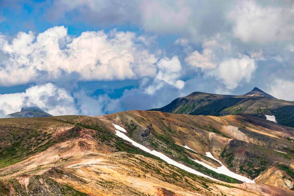 旭岳からの眺望。大雪山系の主峰となる旭岳は標高2,291mあり北海道の最高峰です。アイヌ語の「チュプ・ベツ」(日の川)に由来する四季が美しい山です。