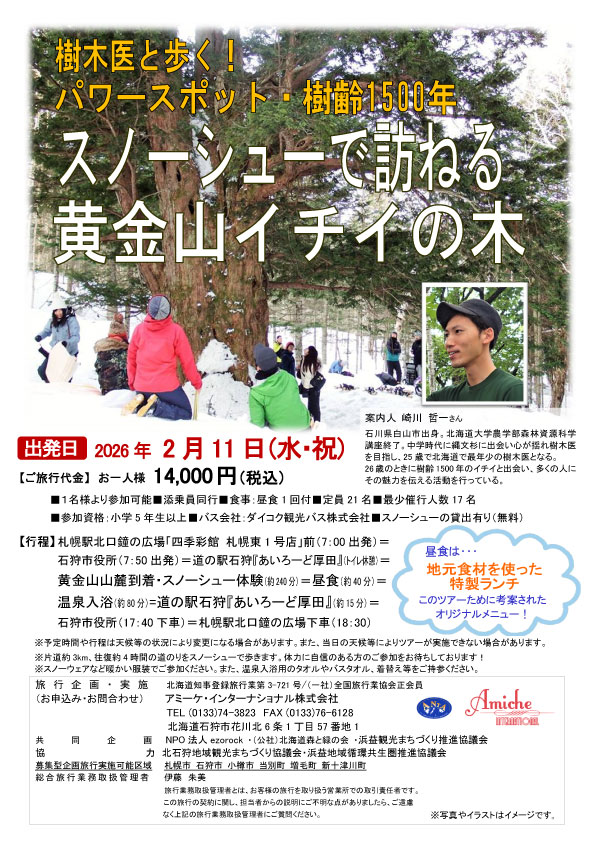 スノーシューで訪ねる「黄金山イチイの木」を観察するツアーが開催されます。